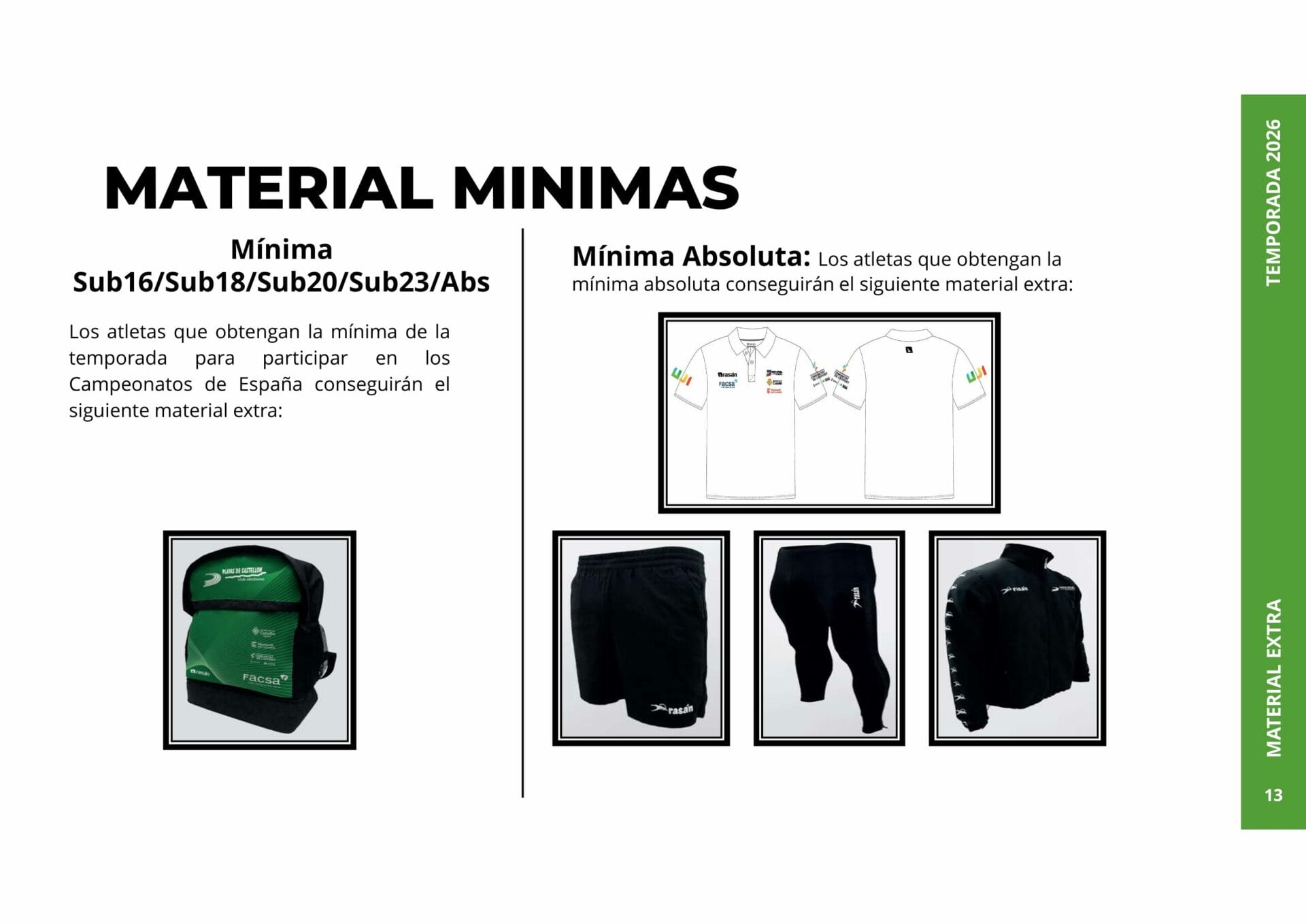 Material exclusivo para aquellos atletas que hayan conseguido marca mínima o repesca para un campeonato de España (establecida por la RFEA según prueba y categoría) o por ranking de marcas hasta cumplir con las plazas disponibles (según la prueba y normativa de la RFEA).